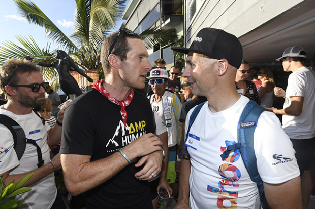 Renowned coach Neal Henderson (right) chats with a friend. Henderson, the former coach of Flora Duffy and current coach of rising star Taylor Knibb, is now recovered from a nasty bike crash.