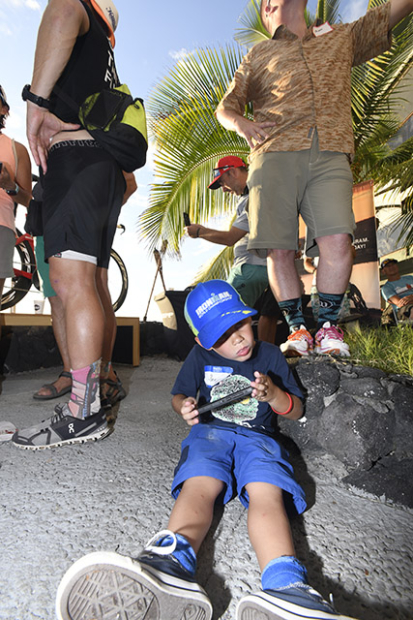 Beneath a Slowtwitch Kona Gathering sign, this invitee cools off in the shade while enjoying the food.