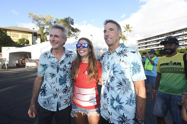 Six-time Kona Champions Dave Scott and Mark Allen pose with a fan.