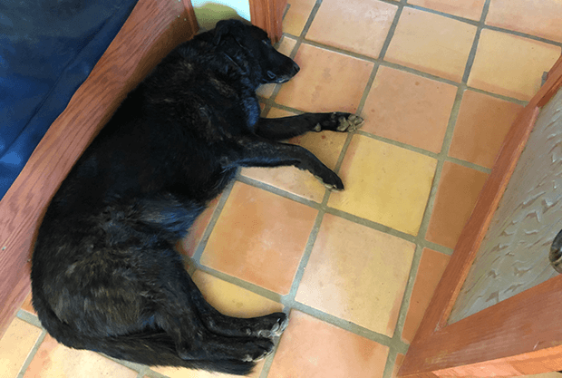 You won’t have people walking in reminding you of a meeting, so, place these meetings on your calendar, with a tickler that shows up on your computer screen so you don’t blow right past them. Microsoft Outlook is my organizer for this. Make sure you know how to soundproof your room for these meetings. Respect yourself. Make sure your computer’s camera shows something decent behind you. Probably a good idea to not look like those guys the morning after the big party in The Hangover. That said, people expect you to lose control of the background. I chaired a call this morning, a meeting of the board of a corporation of which I’m the president. If my dogs start barking in the background, so what? If your family, including the kids home from school, interrupt your teleconference, folks will understand. Don’t worry about that. And your dogs. Bear (below) often guards the office door.