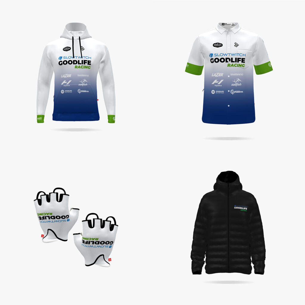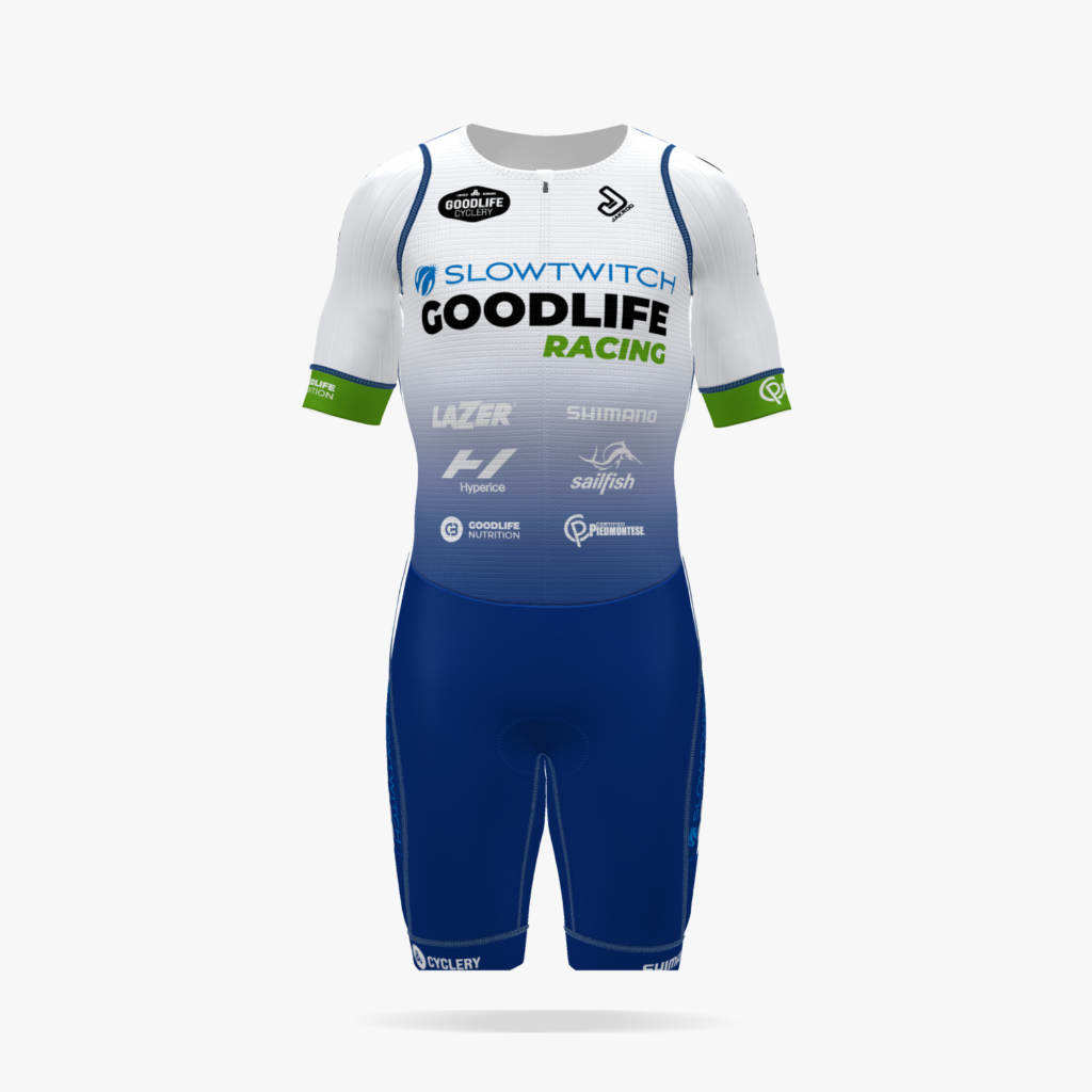 While past iterations of the team apparel (including the Timex, Suunto and TOP teams) have featured various color schemes, the Slowtwitch Goodlife kit this year includes an eye-catching mix of blue, green, and white. These kits are also shipped directly to your door from Jakroo, the custom apparel partner.