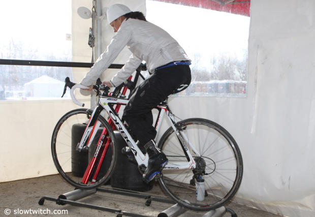 Katie Compton doing a bit of adjustment to her back during the afternoon official training session.