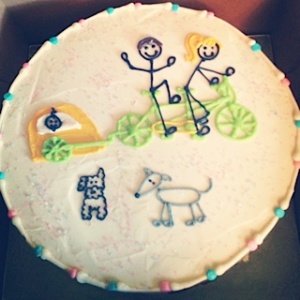 Amanda: I sent you a picture of our cake. We had a bunch of friends over last weekend – some of them didn’t even know I was pregnant. We decided to color the inside of the cake for the gender of the baby. If we cut it open and it was blue on the inside, we were having a boy. If it was pink, we were having a girl. Sure enough, we cut the cake and it was pink! That’s our fun little story.