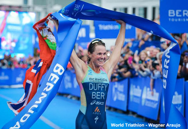 After a race-best 20:15 swim, a second-fastest 1:05:26 bike split and a race-fastest 34:39 run, Flora Duffy finished her home town Bermuda WTCS race in 2:01:26 with a 1:38 margin over Taylor Knibb of the U.S. and 1:51 over Beth Potter of Britain.
