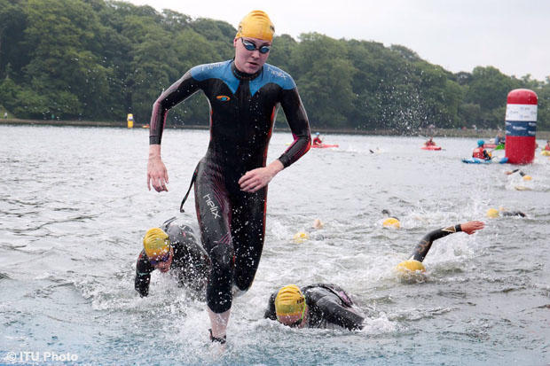 Jessica Learmonth and Lucy Hall of Great Britain broke into the lead on the swim with 9:09 splits, and continued to increase their lead to over a minute by working together on the bike leg with race-best 28:42 and 28:44 splits. While Cassandre Beaugrand of France cut the Brits’ lead by 57 and 59 seconds with a race-best 17:45 5k run, she fell 43 seconds short of the front running duo and had to settle for 3rd. At the finish, Hall’s 18:42 5k split was 2 seconds better than Learmonth, and the 2012 Olympic domestíque edged Learmonth by 1 second for the victory.