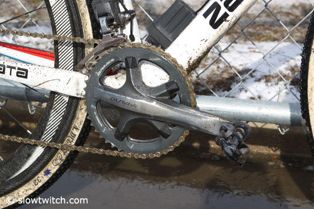 Dura-Ace cranks with the Di-2 battery mounted low on the down tube via the water bottle mounts.