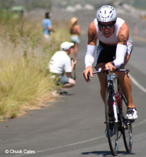 Once on the bike it became clear very fast that Chris Lieto wanted to take charge. He soon managed to gain a nice advantage over a fairly large pack of riders that contained most favorites. But no matter who went to the front of the chasing pack, Lieto kept padding his advantage. Meanwhile speculations had circulated that Normann Stadler was not completely feeling well, and that would turn out to be true. By mile 23 he had stopped by the side of the road to throw up, but he would soldier on after that. But by about mile 53 Stadler dropped out and would eventually make the return trip on a stretcher. At the same time Torbjorn Sindballe (DNK) made his move to catch Lieto who by now had amassed a 4:30 lead. On the way back from Hawi, Sindballe was flying and he started to gain serious time on Lieto. At about the same time it was clear that Cam Brown (NZL) and Luke Bell (AUS) were not having a great day and shortly after they would drop out. Sindballe though was on a mission and shortly after mile 90 he caught and passed Lieto. He then arrived first in T2 with a great bike split of 4:25:26.