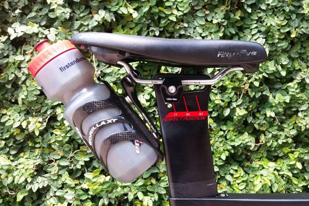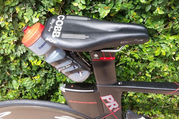 A Cobb JOF 55 saddle keeps Hanson riding comfortably and allows for an additional bottle to be attached to the saddle rails using an XLAB Gorilla XT cage. Black electrical tape marks his desired seat height.