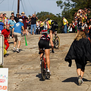 Finally, in line with our “participant experience first” mission, we strive to really put on an event that stands above all the rest, and I think that effort has paid off. In addition to the truly unique award of a personalized brick laid in the road for all who clear the Westernport Wall cleanly and go on to finish the race, we try to go the extra mile with many little things that the athletes and families alike appreciate. For example: free spectator buses to the Westernport Wall block party, excellent food and ice cream at finish, extensive and useful schwag like arm warmers, a well-staffed, well-marked and accurately marked course, an average of over 40 race photos per athlete offered for sale well below market rates, a bike course littered with encouraging and humorous (some may say mocking) signs such as “Who’s Making Fun of Triples Now?” on a 20% grade, themed aid stations full of costumed volunteers, a race-within-a-race with timing and prizes for the 7.1 mile ascent of Big Savage Mountain, and more.