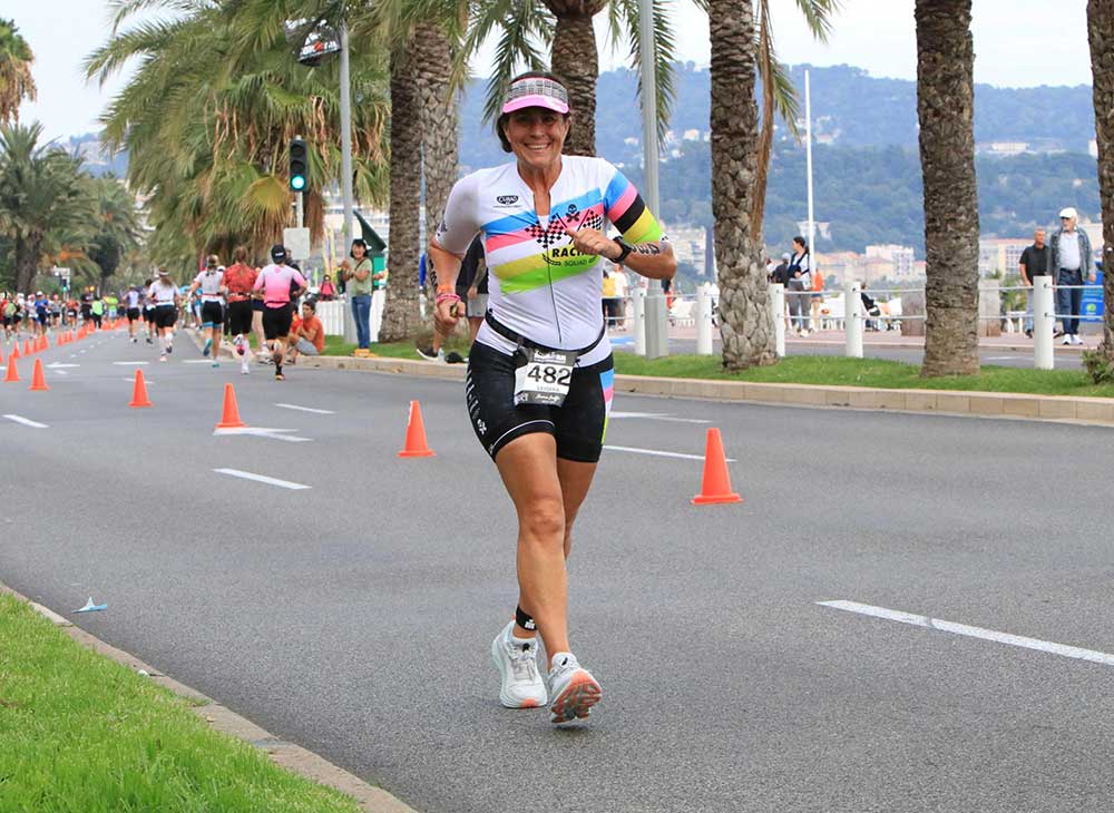 Kona is an easier trip for her as she lives in the Bay Area and flies from SFO.   For Nice, her itinerary was SFO to Charles De Gaulle (Paris), and then south.  Also worth noting is Leisha’s throttled-back ambition for this race due to injury.  “Multiple fractures in my toe in my qualifying race so I had no idea if I was going to finish the run. I went by feel and enjoyed every moment, which maybe unless you are going to win your AG is the right way to race.”
