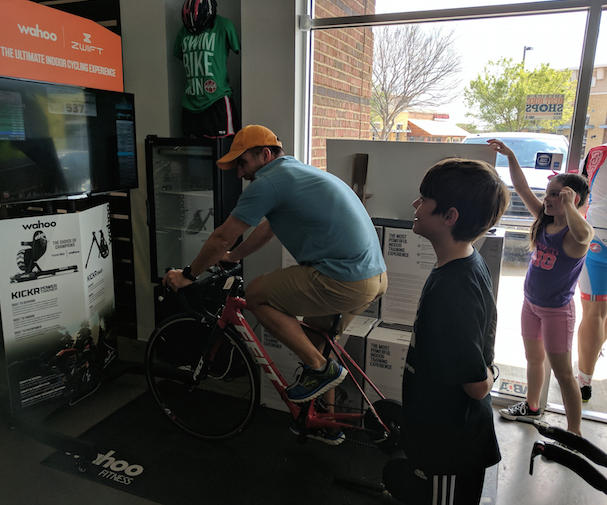 A family cheers on Dad as he mashes his way over 600 watts in a Zwift demo station set up in the shop.