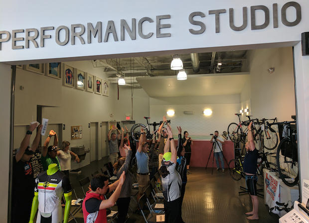 Throughout the day, seminars were held inside Tri Shop's dedicated "Performance Center". Here Richard Garza, Master's swimming coach at Texas Ford Aquatics, leads attendees through a series of stretches.