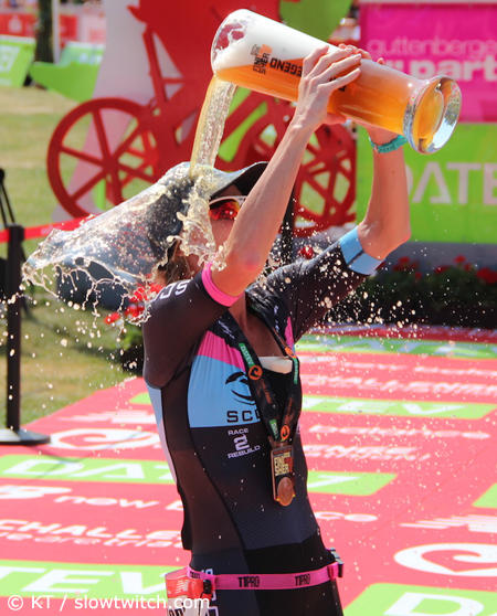 Runner-up Carrie Lester gives herself an Erdinger beer shower after finishing second.