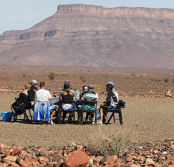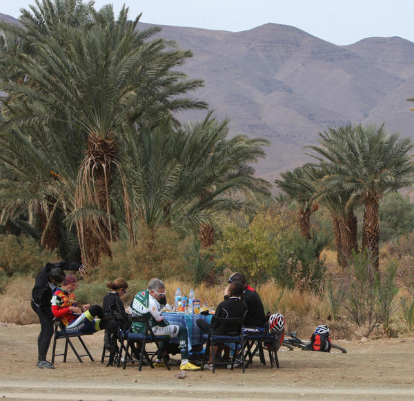Lunch, after a hard descent, before a ride through an acacia forest.