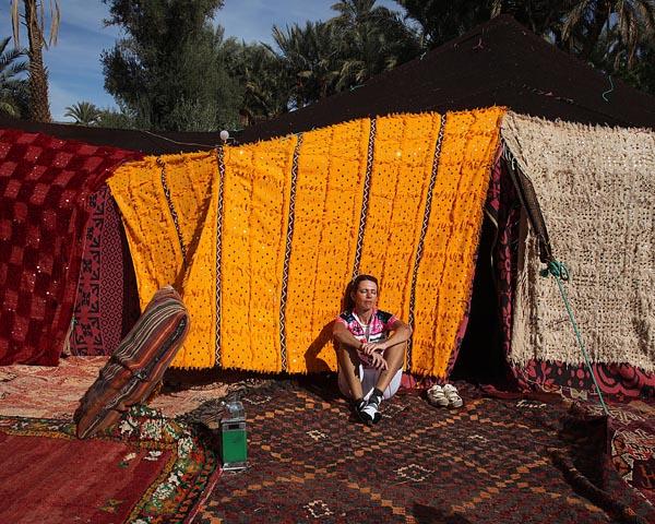 One of our group, after a hard day's riding, resting against that night's lodgings: Moroccan tents sitting on Berber rugs.