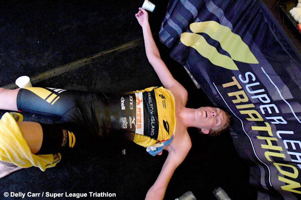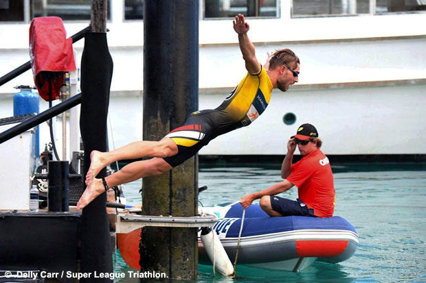 The debut of the Super League Triathlon sprint series delivered on one of its promises on the first of three days of action on the $206,800 Hamilton Island, Australia event on St. Patrick’s Day. In the Triple Mix format action – three lightning-quick triathlon stages, each mixing the order of the 300-meter swim, 6 kilometer bike leg and 2 kilometer run leg – the order of finish was radically shuffled in each leg as master swimmers, cyclists and runners were rewarded depending on the order of the disciplines.