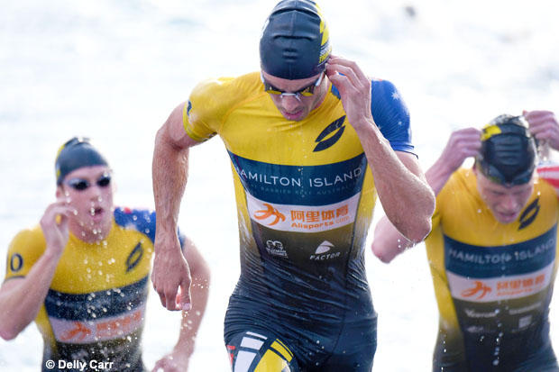 Eleven hours later, the elites lined up for a rolling start in pursuit format of the opening leg – a 300 meter swim. Dye led off, followed by the rest of the field at intervals matching their deficit to the leader after the morning’s individual time trial. Dye held the lead until the final meters when he was overtaken by Birtwhistle and Fisher, while Murray maintained his 8th place finish in the morning ride.