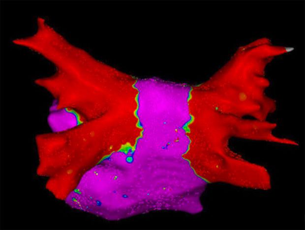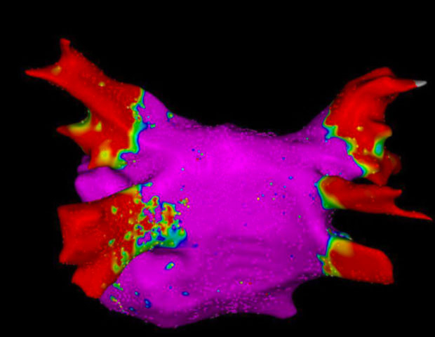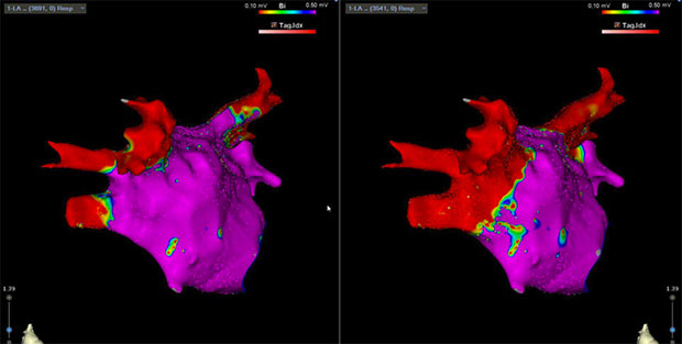 One helpful diagnostic tool is voltage mapping. Your EP can chart your heart’s misbehavior through looking at low-voltage areas that are color coded and I’m including the voltage map of my left atrium above that I believe is pre-ablation. If I understand it right, what you don’t want is yellow and green and that kind of doppler imaging that looks like a tornado is about to spring up. That nice, docile red area in the post-ablation image below is – as I understand it – a heart prepared to behave.