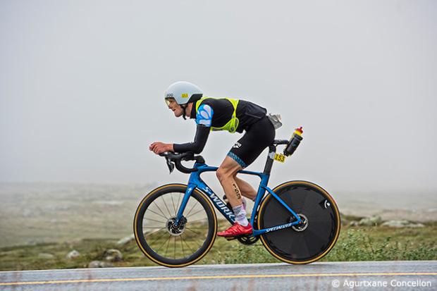 Estonian Heiko Sepp in action early on in the bike segment after a 1:09:58 swim.