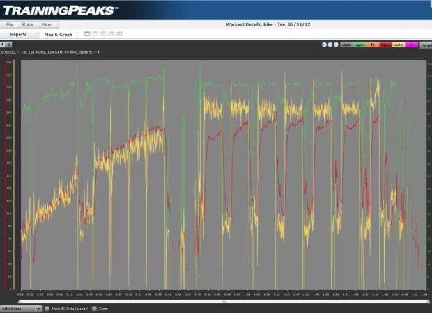Sarah’s session this day was about an hour, with a main set of five minute intervals and two-and-a-half minutes rest. The ride was followed by a ten mile trail run, with Nate on his mountain bike. This is all part of her late-season peaking phase, for big races such as the Chicago triathlon and Hy-Vee. She rode her Fuji D6 bike equipped with Shimano Di2, a Rotor-Quarq crankset (172.5mm), Zipp 303 clincher wheels, Oval Concepts bars, ISM saddle, and Sampson pedals. Resistance was provided by a Computrainer, but they use the Quarq system for power measurement. Output was measured on three devices: