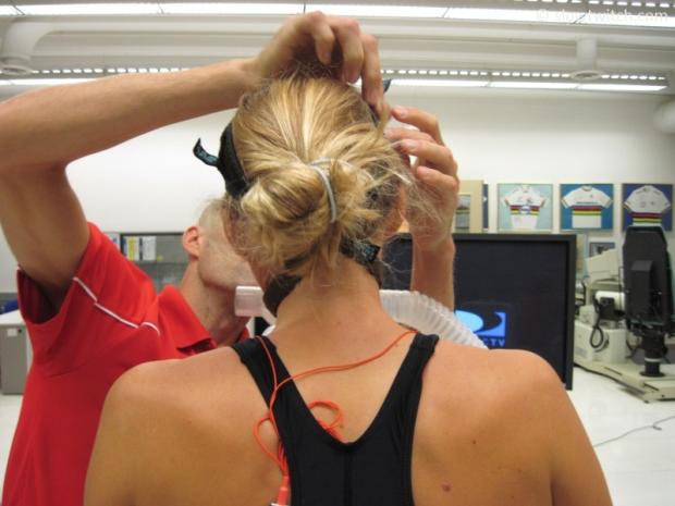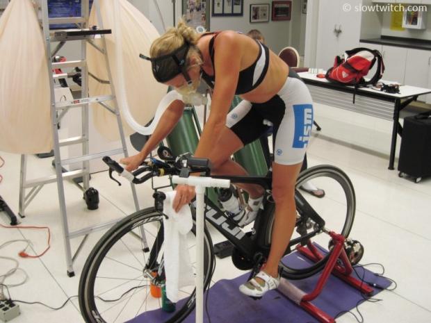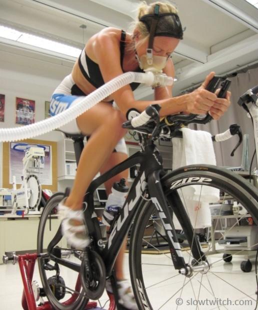 Sarah’s session this day was about an hour, with a main set of five minute intervals and two-and-a-half minutes rest. The ride was followed by a ten mile trail run, with Nate on his mountain bike. This is all part of her late-season peaking phase, for big races such as the Chicago triathlon and Hy-Vee. She rode her Fuji D6 bike equipped with Shimano Di2, a Rotor-Quarq crankset (172.5mm), Zipp 303 clincher wheels, Oval Concepts bars, ISM saddle, and Sampson pedals. Resistance was provided by a Computrainer, but they use the Quarq system for power measurement. Output was measured on three devices: