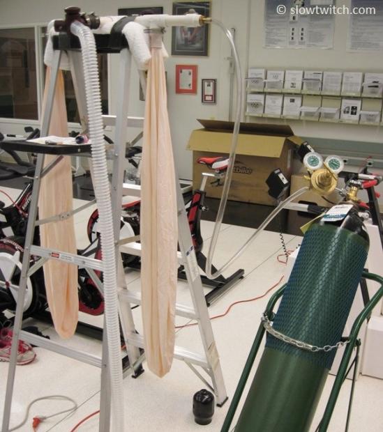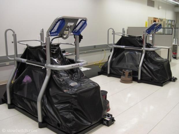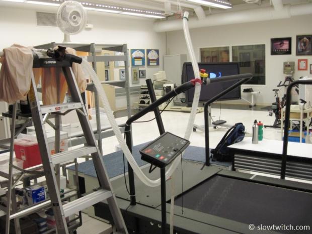 There is an identical oxygen rig set up nearby on a treadmill. No O2 running for Sarah today, however.