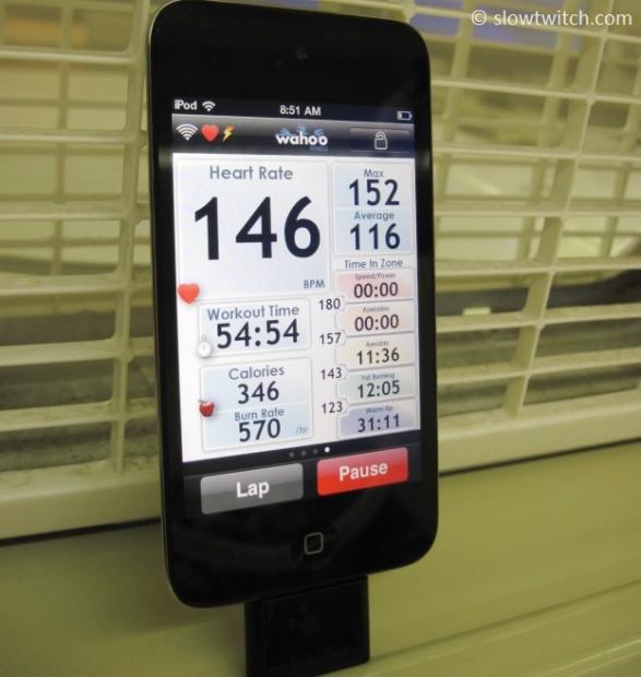 2. An iPhone with Wahoo Fitness ANT+ receiver, placed on a table in front of Sarah (for heart rate metrics)