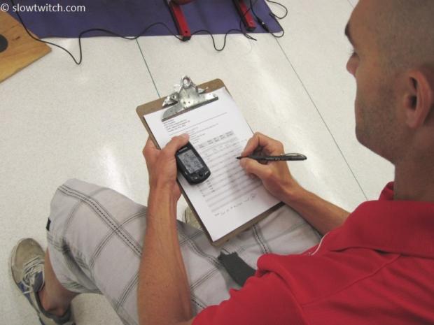 Nate takes note of all the data, including lap wattage, cadence, heart rate, and rate of perceived exertion (RPE).