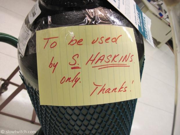 Sarah purchased this tank herself… and the note attempts to thwart would-be O2 thieves.