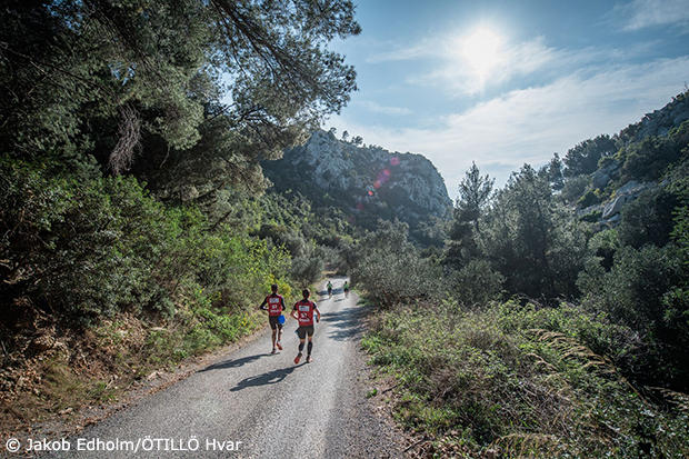 The French mixed team of Caroline Dewaele and Nicolas Dewaele run along the coast near Hvar on fairly tricky terrain.