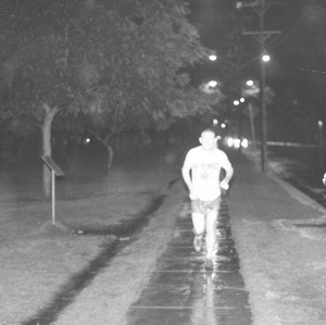 Don’t get me wrong. I wasn’t in a state of euphoria, but I felt really good considering what I’d already put my body through. For the first time, I felt confident that I could finish the thing. That feeling lasted until I had reached the turn-around point of the marathon. I don’t know why, but it seemed that for no reason I was getting tired extremely suddenly, like when a car runs out of gas. One minute you’re going along great, and then it sputters a few times and you’re coasting to a stop. Just like that. I was through. My good stride had been reduced to a shuffle. I was not just tired; I was tired of being tired. I was tired of hurting. I was tired of just shuffling. I was tired of running in the dark and not being able so see well. By that time I had only about three miles to go; I knew I was going to finish. There was no question of “could I;” I was just going to keep putting one foot in front of the other, and sooner or later I would see the finish line. Just over Diamond Head was Kapiolani Park and the finish line. As we topped the crest of Diamond Head, Lou and Nolan left me to get to the finish line. I was okay, nothing would stop me now. It was just before midnight, and it was misting rain. I was seeing by the light of the street lights, but I couldn’t see the finish line. I thought that it must be right in front of me, but where was it? I couldn’t see it.