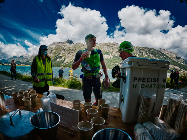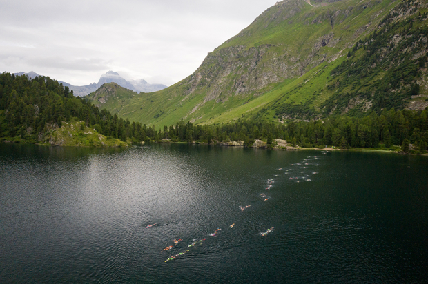 The first swim of the race in Lej Cavloc at 1900 meters of elvation is the coldest swim of the day with temps typically in the high 40s during this time. But after running uphill before and a difficult uphill charge right after this swim it actually is not as bad as it may sound.