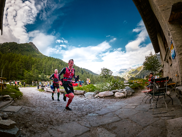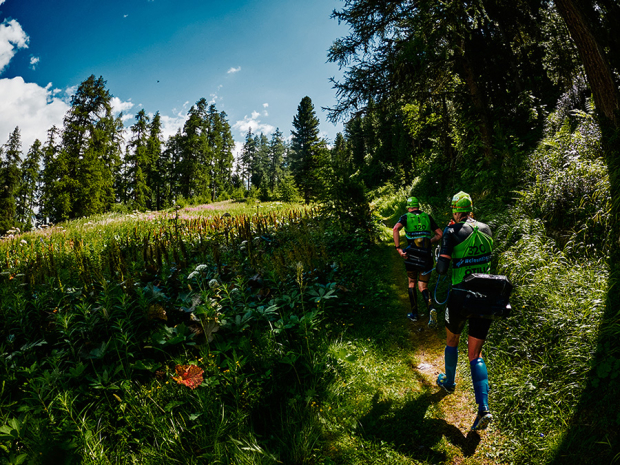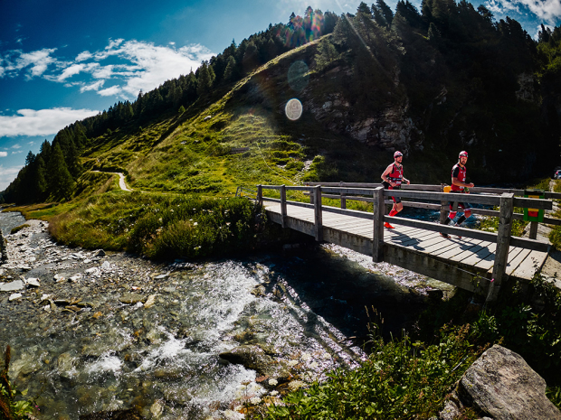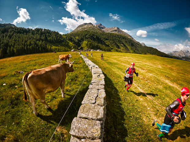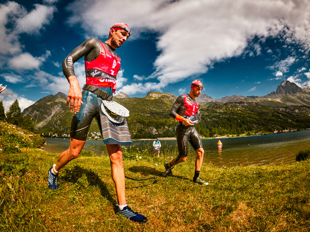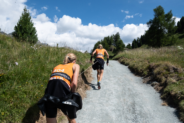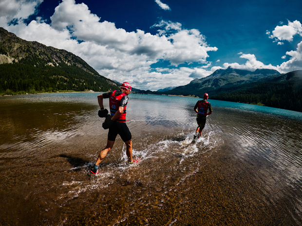 Athletes encounter a variety of terrain as they race through the Engadin valley. Here Swiss Bastiaan Breine and Belgian Gertjan Winten push up a cobbled climb on the way to 6th place in the male division.