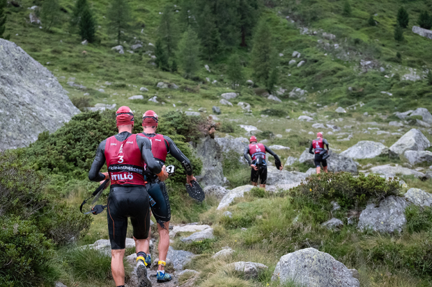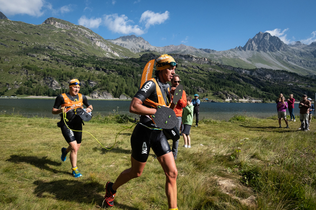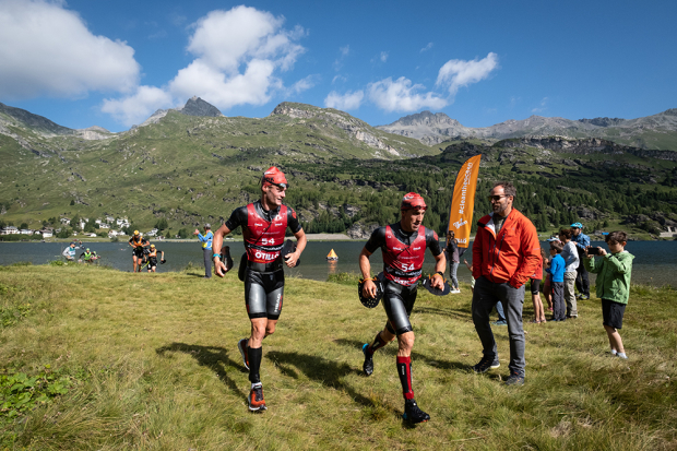 Over 400 athletes from mostly Europe gathered socially distanced in Silvaplana, Switzerland to participate in one of the first bigger events since COVID19 hit the world. These 400 athletes were spread out over several events with two shorter races happening on Saturday and the main World Series race taking place on Sunday. 103 teams had been registered for that World Series event but only 78 teams came to the start. Among them several professional triathletes who may have jumped into this event with not much else going on yet, and among them were Antony Costes and Jan Van Berkel. The ÖtillÖ organization had laid out a new COVID19 Safety Management Plan to make this event happen and along those lines masked and gloved volunteers and hand sanitizer were seen all over the course. Plus social distancing was pushed hard too. In general though in this sport on such challenging terrain the athletes get spread out quickly.