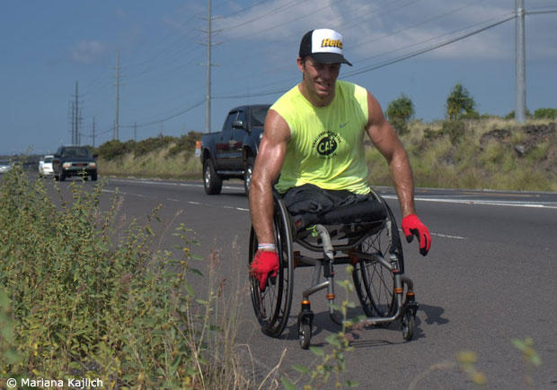 When I returned to the US I found a used racing wheelchair, which I was using to exercise. Soon after that some amputees I’d met were heading to a charity triathlon, an event put on by the Challenged Athletes Foundation in San Diego. I did the swim and run and had a teammate who hand cycled. From there I was hooked and 12 months later had qualified for and gotten across the finish line in Kona.