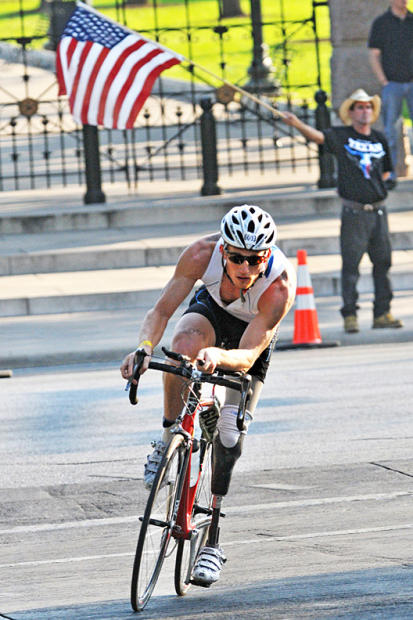 A Wounded Warrior veteran is riding hard at the Cap-Tex Triathlon as a patriotic Austin spectator waves Old Glory.