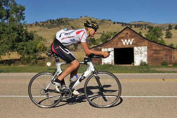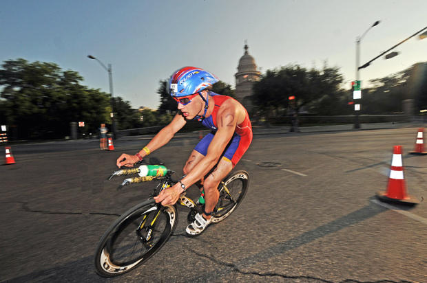 A Wounded Warrior veteran is riding hard at the Cap-Tex Triathlon as a patriotic Austin spectator waves Old Glory.