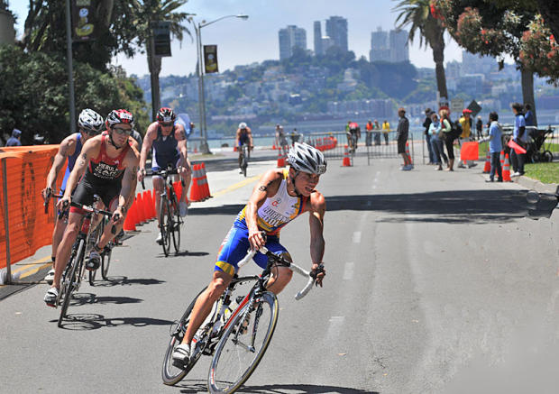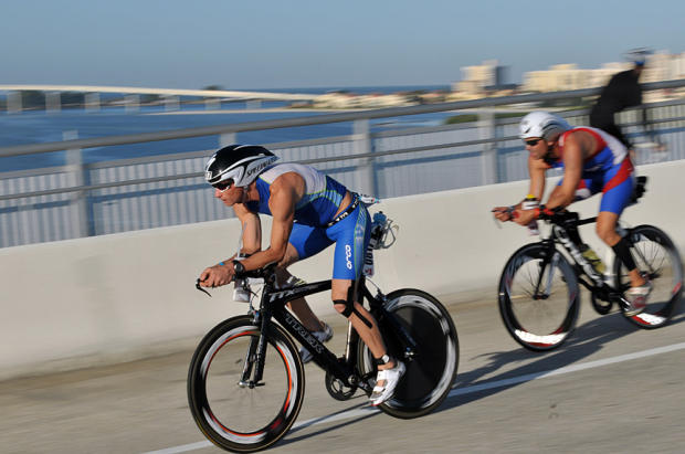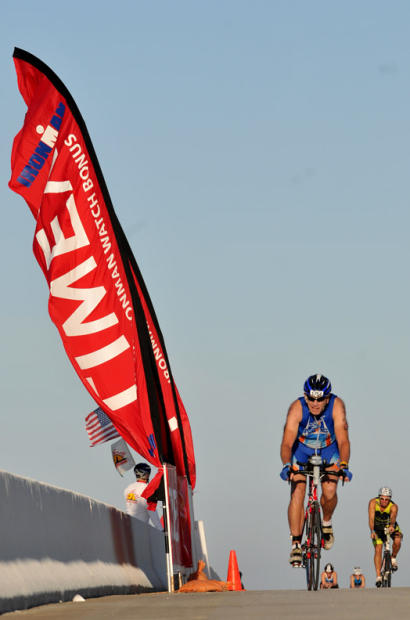 Age group competitor crests the causeway at the Ironman 70.3 World Championship in Clearwater.