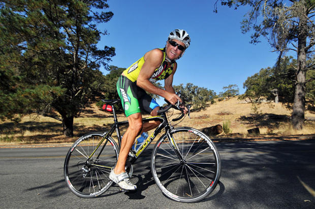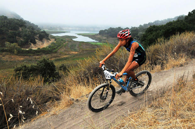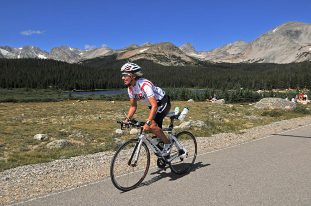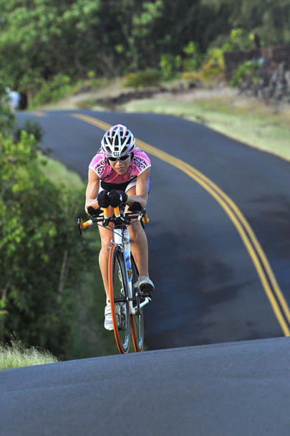 Kathy Winkler of Marin, California, is charging up a hill on Day 2 of Ultraman.