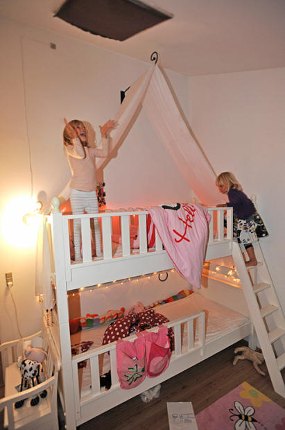 Caroline (left) and Emilie (right) climb to the top of their imaginary castle in their double-decker bunk beds.