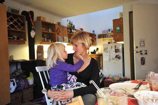 Anita holds 3 ½ year-old Emilie in her lap for a post-dinner chat.