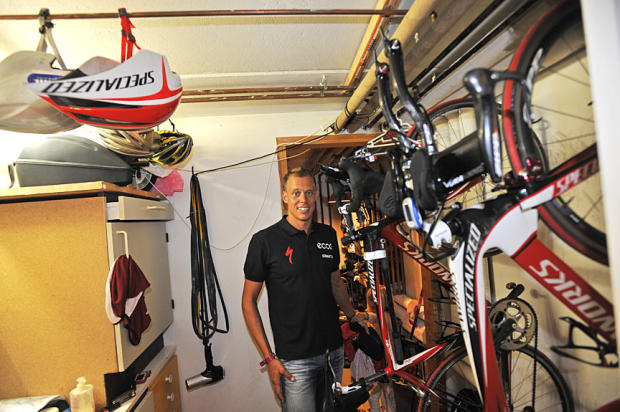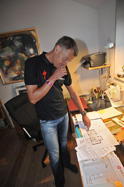 With typical Danish economy of space, Rasmus fits his large quiver of racing bikes and gear in what amounts to a space capsule in the basement.