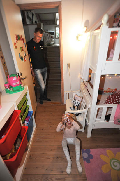 Rasmus helps young Emilie safely join her sister Caroline jump on their parents’ bed.