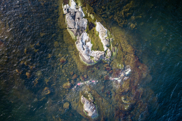 The leading mixed team of Desirée Andersson and Victor Dahl heading towards another swim. Sometimes you can see the the next swim distance ahead and where the exit is, but at other times you can't.
