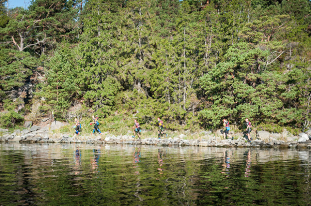 Teams running along at the edge of one of the 24 islands that teams have to cross.