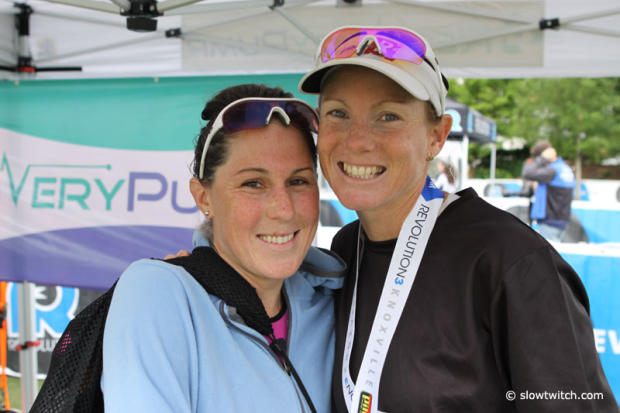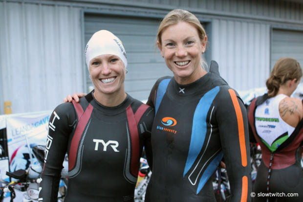 Almost time to head to the swim start, but Amanda Lovato and Leanda Cave have a moment to smile for the press.