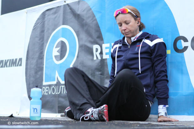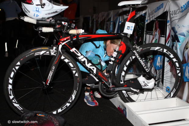 Aussie Annabel Luxford setting up her transition area including her ITU ready race rig.