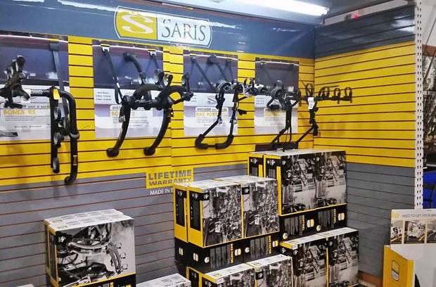 A color coordinated wall inside Bike Mart makes the perfect home for the Wisconsin-based Saris bike racks.