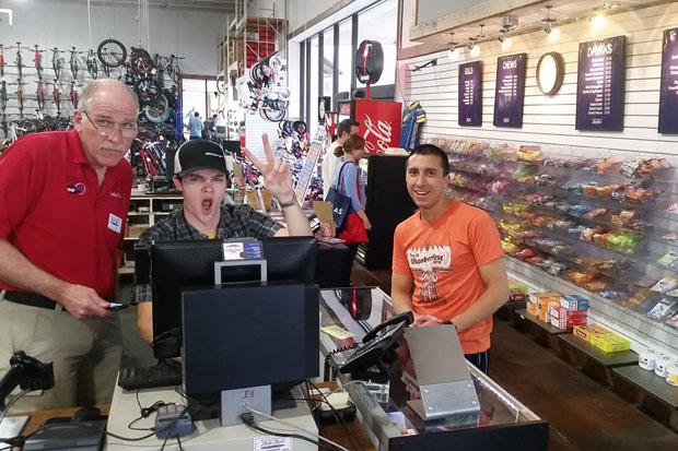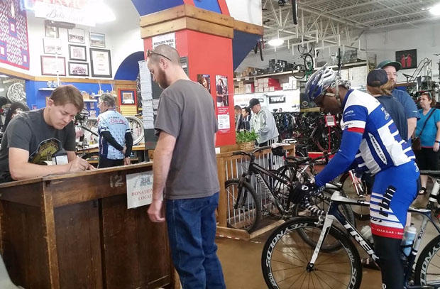 Theresa Francesconi (far left) was instrumental in getting this event off the ground and Ken “Woody” Smith (center) is the General Manager at Bike Mart. Both seen here sharing a laugh with HED’s Andy Tetmeyer.