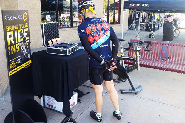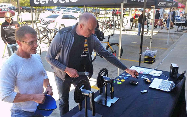 A rider checks out two of the three power options (chainring and pedal) PowerTap had on hand.
